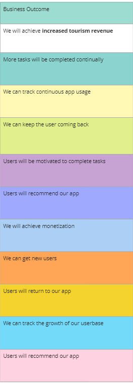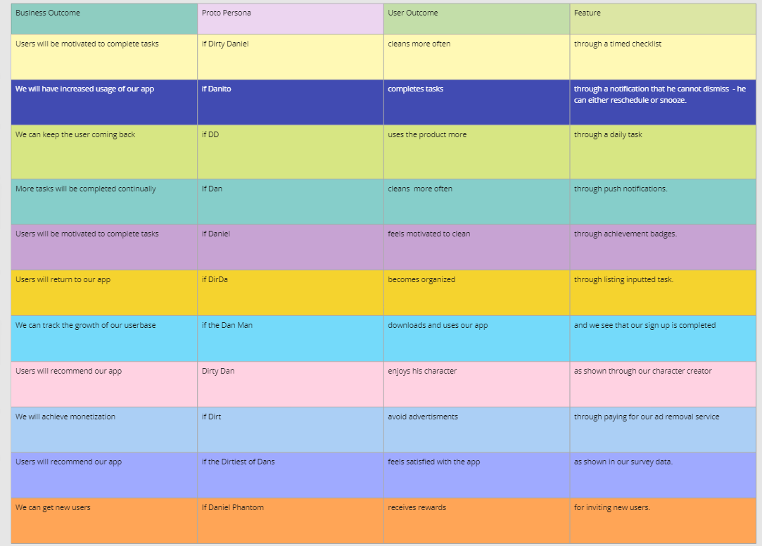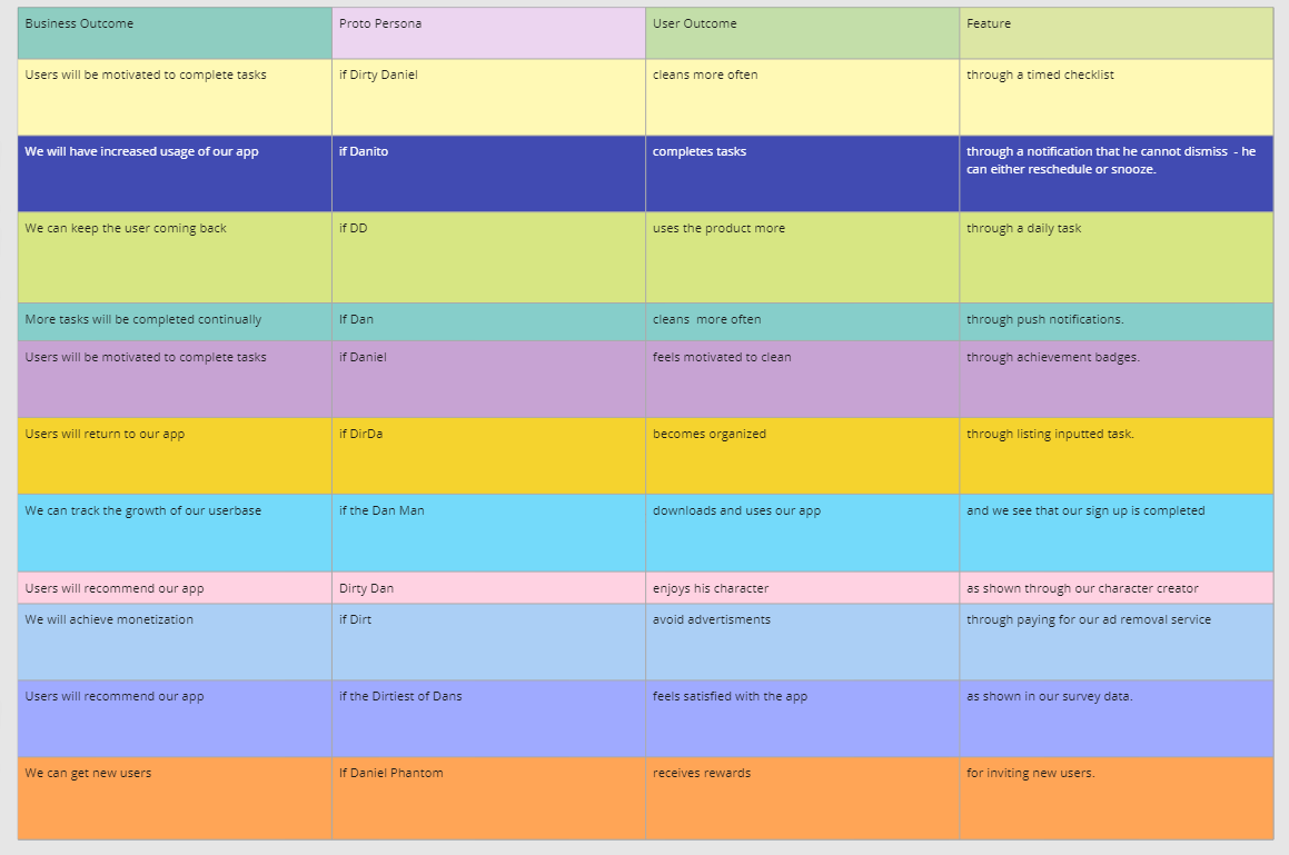 With our assumptions we made many hypotheses. The hypotheses includes the business outcome, proto-persona, user outcome and the features of the app. This helps us create an MVP or known as a minimum viable product which allows us to test assumptions. Becoming our product backlog and below is the hypothesis statements: