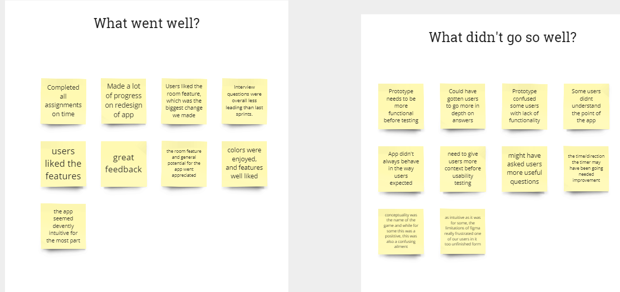 By the end of sprint 1, our team had a retrospective meeting in order to find out what went well and what not so well. This is how we made our vast changes in sprint 2.